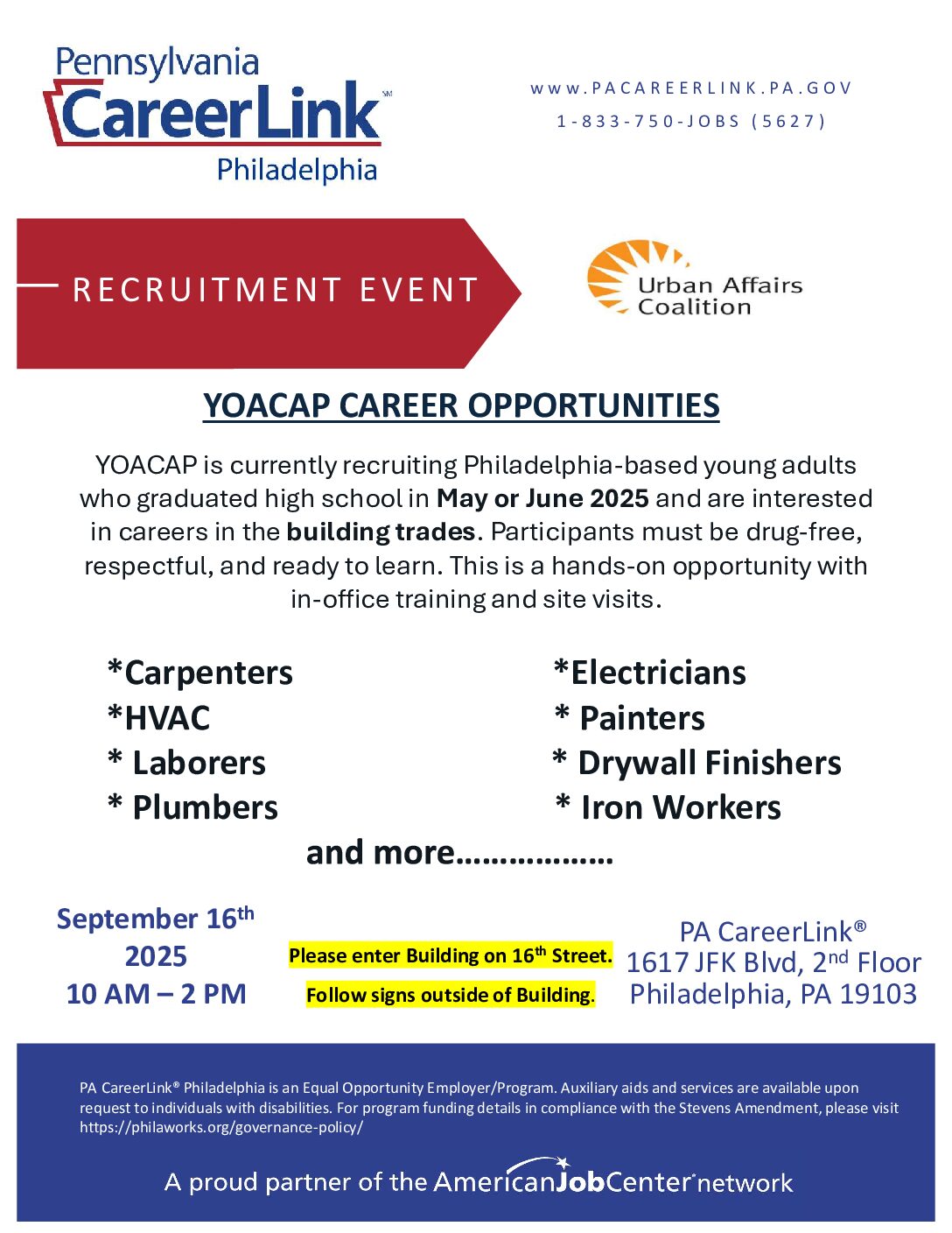 YOACAP is currently recruiting Philadelphia-based young adults who graduated high school in May or June 2025 and are interested in careers in the building trades. Participants […]