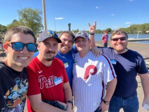 The Cooper River Yacht Club offered an indoor gathering space, covered seating area, and outdoor activity area with a view of the Philadelphia skyline. Attendees also set up chairs along the lawn to chat and enjoy the warm, sunny weather.